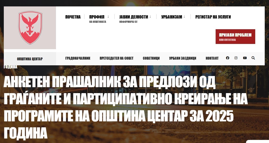 Општина Центар на располагање става електронски Анкетен прашалник преку кој ги вклучува граѓаните во креирање на Буџетот за 2025 година. Градоначалникот на Општина Центар Горан Герасимовски повикува граѓаните да даваат предлози за потребите во нивните маала.