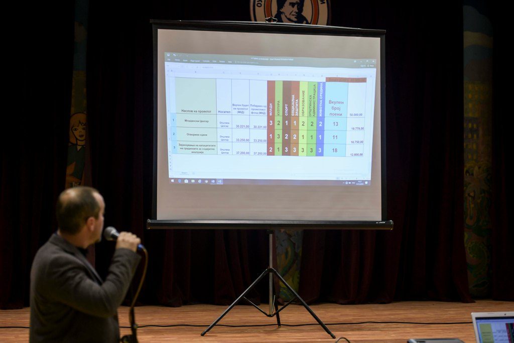 Три од предложените проекти стигнаа во последната фаза, односно четвртиот граѓански форум, каде сите присутни работни групи по претходно утврден систем, гласаа и ги рангираа по редослед. Прворангираниот проект ќе добие целосна, а второ и трето рангираните предлог проекти ќе добијат делумна поддршка за реализација на проектите.