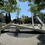 Станува збор за футуристичка конструкција со неправилни облици, клупи, декоративно зеленило и паркинг за велосипеди која е донација од Стопанска банка АД – Скопје.