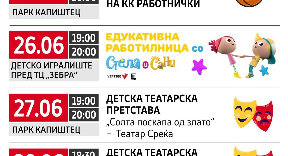 Сакаме да ве разиграме, и да ве размрдаме со спортски и рекреативни активности но и со следење на детски театарски претстави и организирани креативни работилници.