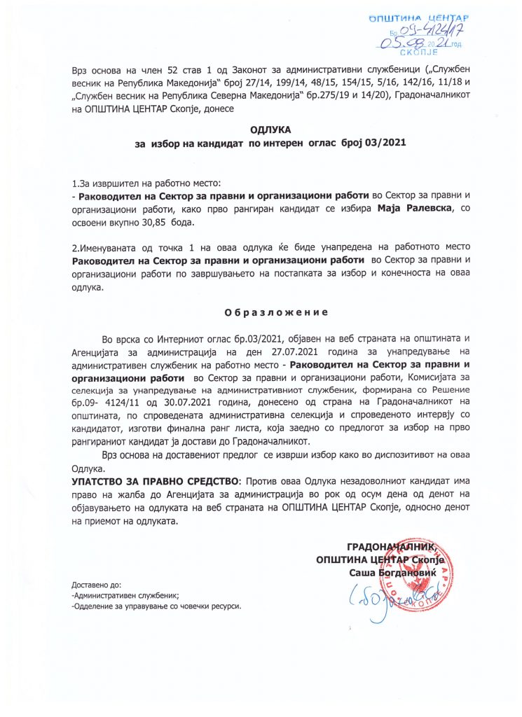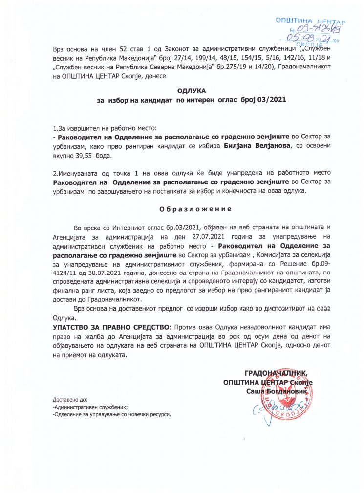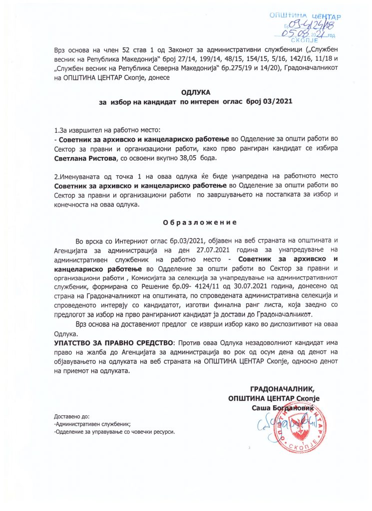 Општина Центар објавува одлуки за избор на кандидати по интерни огласи.