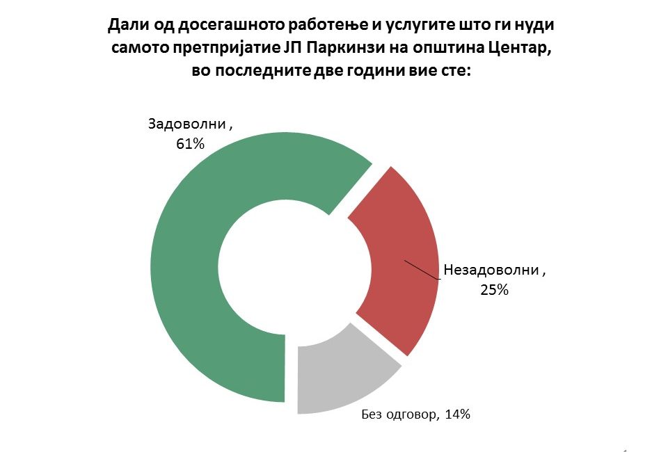 Според последното истражување на јавното мислење, расте задоволството на граѓаните од целокупното работење на ЈП „Паркинзи на Општина Центар“. Врз основа на добиените резултати од анкетата, речиси две третини, односно високи 61% од жителите на Општина Центар позитивно ја оцениле целокупната услуга која ја нуди претпријатието.