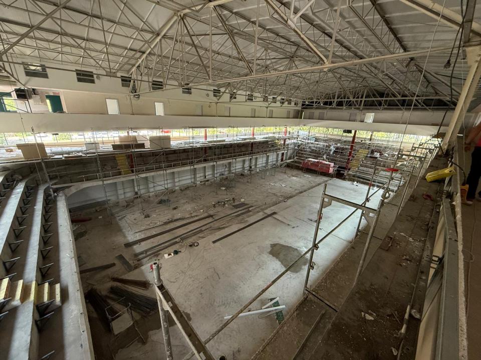 Основната бетонска конструкција на гледалиштето е комплетно завршена, а трибините се оформени и поставени метални потпори за седишта. Следната фаза вклучува поставување кошулица и подно греење, а монтажа на подот е закажана за 20 септември.