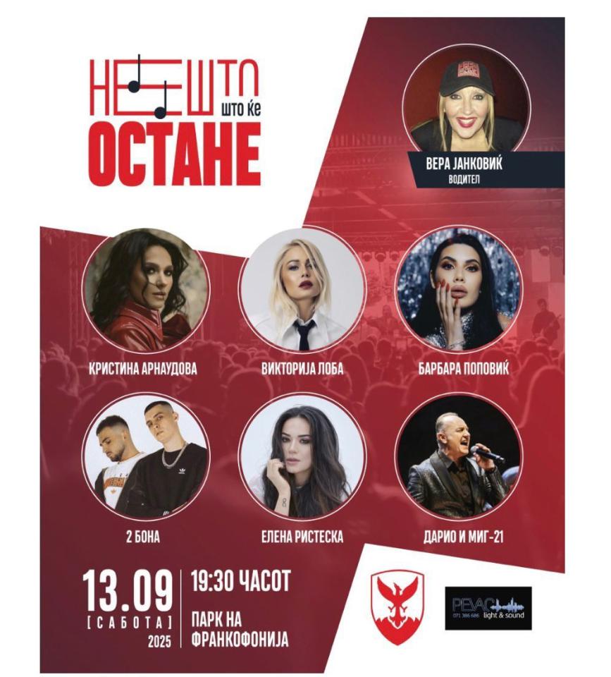 И оваа година, музичкиот хепенинг „Нешто што ќе остане“ повторно ја носи вистинската магија во Центар. Во сабота, 13 септември 2025 година, со почеток во 19:30 часот во Паркот на Франкофонија, скопјани ќе имаат можност да уживаат во настапите на најпознатите македонски изведувачи Кристина Арнаудова, Викторија Лоба, Барбара Поповиќ, 2 Бона, Елена Ристеска и Дарио со Миг-21. Вечерта ќе ја води Вера Јанковиќ.