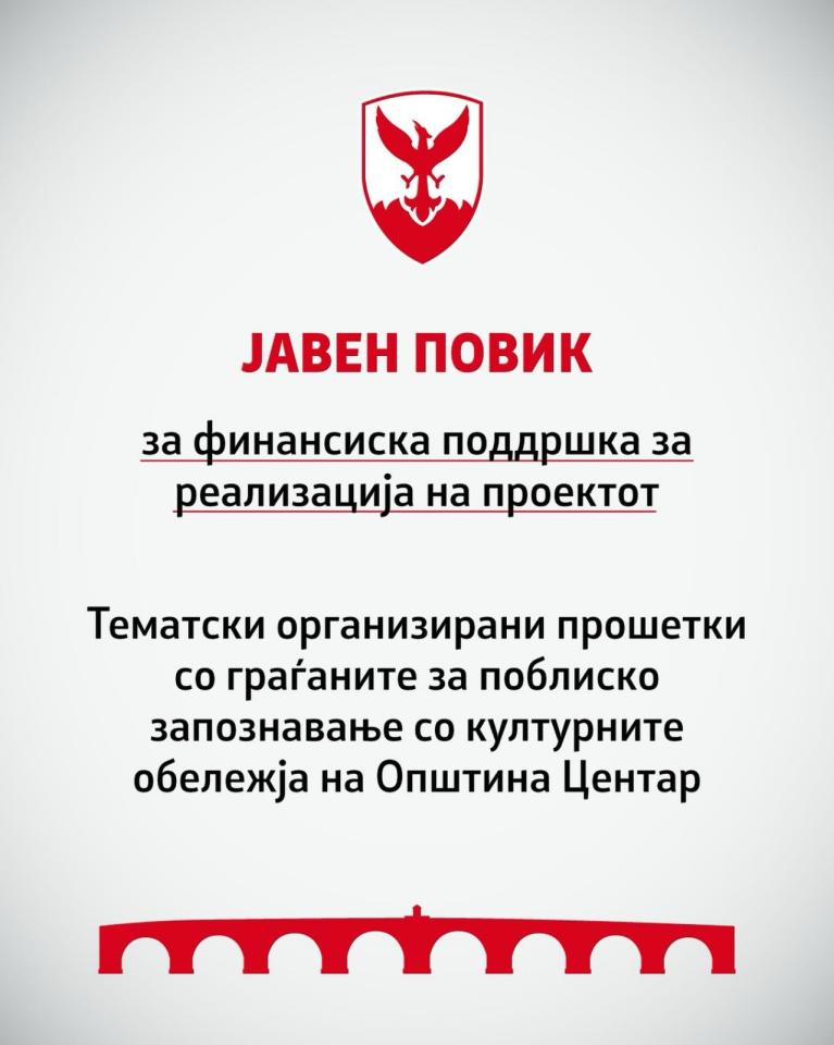 Општина Центар објави јавен повик за реализација на проектот „Тематски организирани прошетки со граѓаните за поблиско запознавање со културните обележја на Општина Центар“, во рамки на Програмата за култура за 2026 година.