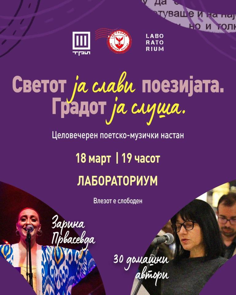 Градоначалникот на Општина Центар, Горан Герасимовски, ги поканува сите љубители на поезијата и музиката на 18 март, од 19:00 часот, во „Лабораториум“, на целовечерен поетско-музички настан „Светот ја слави поезијата. Градот ја слуша!”