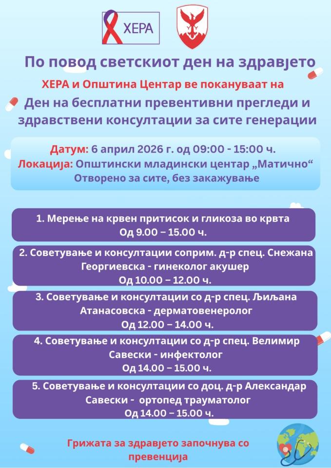 Во пресрет на Светскиот ден на здравјето, Општина Центар на 6 април (понеделник) организира бесплатни здравствени консултации за граѓаните, кои ќе се одржат во Општинскиот младински центар „Матично“, во период од 09:00 до 15:00 часот.
